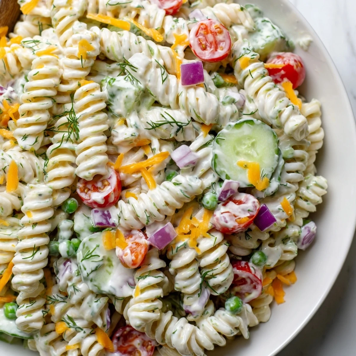 Short pasta shapes with nooks and crannies hold dressing well. Rotini, fusilli, penne, or farfalle are excellent choices. The twists and tubes capture the creamy coating and small vegetable pieces.