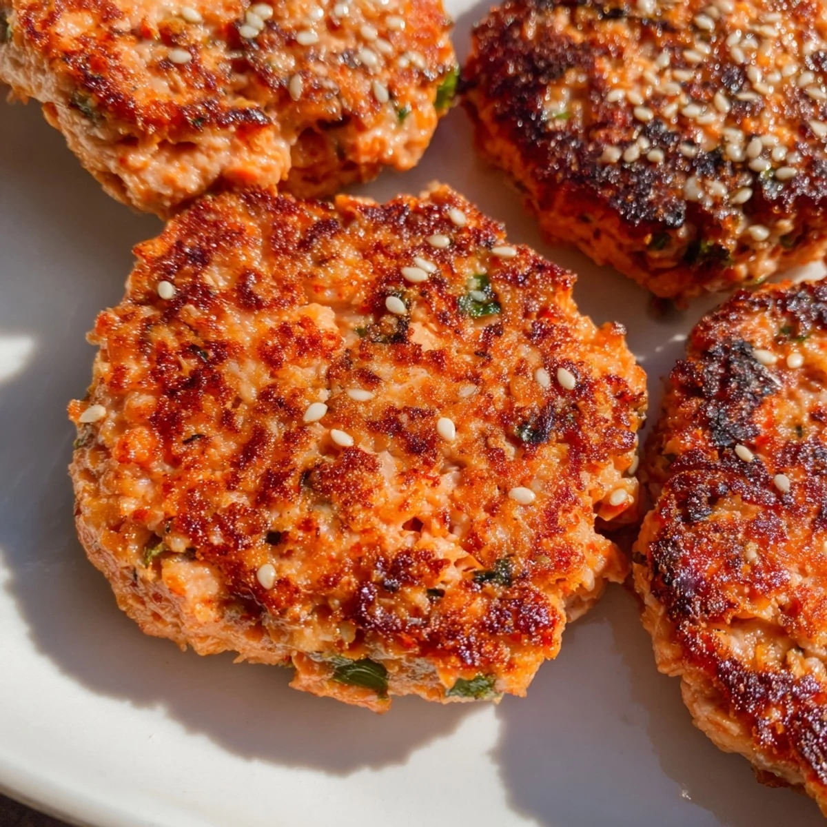 These golden seared salmon patties combine fresh fish with bold North African flavors. Coarsely ground salmon gets mixed with fiery harissa paste, aromatic garlic, cumin, and nutty toasted sesame seeds. The mixture binds perfectly with panko and egg, shaping into eight crispy fillets that pan-fry to golden perfection in just ten minutes. Serve these spicy aromatic cakes hot from the skillet, garnished with fresh cilantro or lemon wedges. They pair beautifully with cooling yogurt sauce, fresh salad, or stuffed inside warm pita bread for a complete meal.