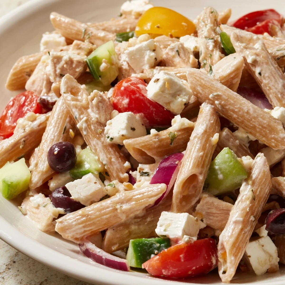Last summer my neighbor brought this to our block party and I literally hovered around the bowl until she laughed and wrote down the recipe for me. Something about the tangy Greek yogurt dressing mixed with that salty feta just works differently than regular pasta salad. Now it is my go-to for everything from meal prep Sundays to last minute dinner emergencies when I need something substantial but do not want to turn on my oven.