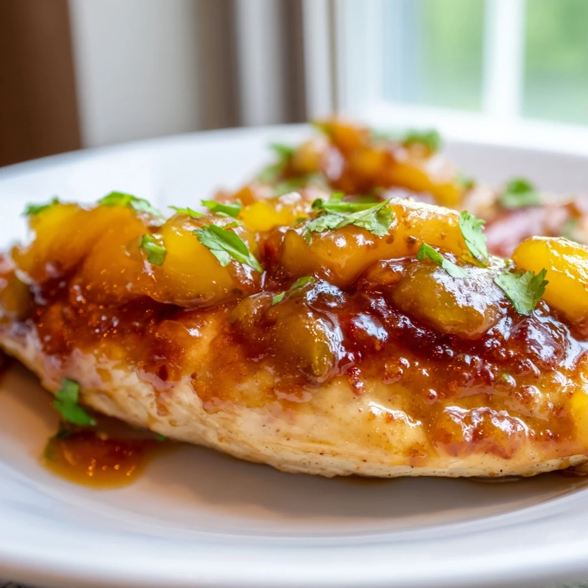 - Let everything rest for 2-3 minutes so the juices redistribute, then serve with extra sauce spooned over the top, those fresh peach slices, and a scattering of herbs