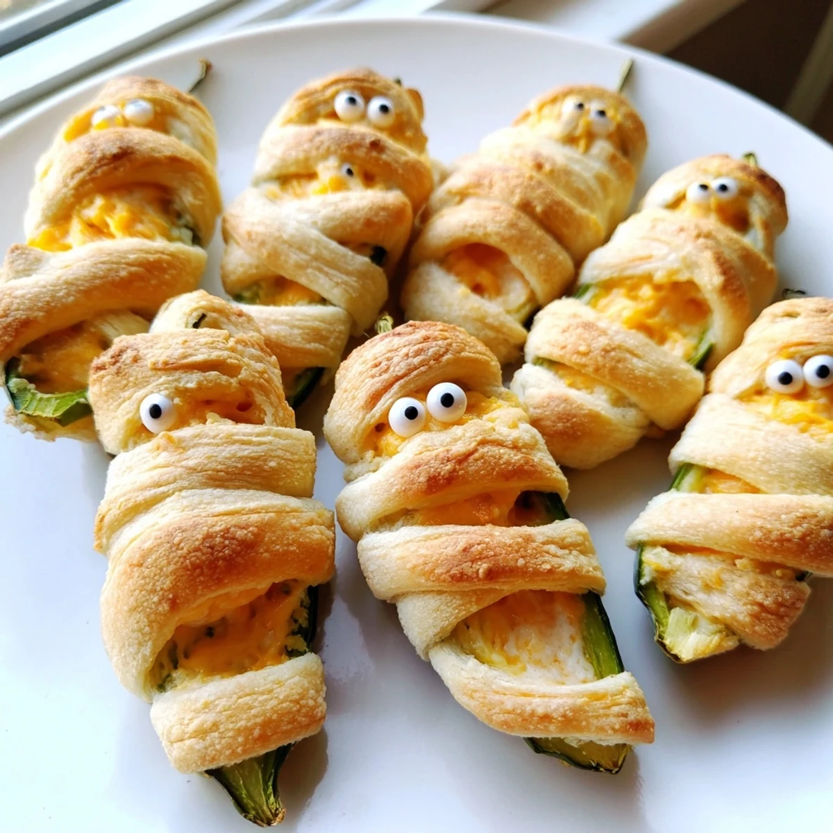 These spooky stuffed peppers combine fresh jalapeños with a rich cream cheese and cheddar filling, all wrapped in strips of crescent dough to create adorable mummy bandages. After baking until golden, simply add candy eyes or olive slices to bring these crispy treats to life. Ready in under 40 minutes, they're ideal for Halloween entertaining or creative snacking.