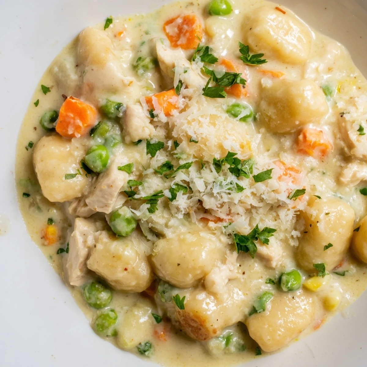 This hearty one-pot dinner brings together tender shredded chicken, soft potato gnocchi, and classic vegetables in a velvety cream sauce. The gnocchi absorbs all the savory flavors while simmering directly in the broth and milk mixture, creating thick comfort food without a separate crust. Ready in under an hour with just one pan to clean, this filling meal serves four perfectly.