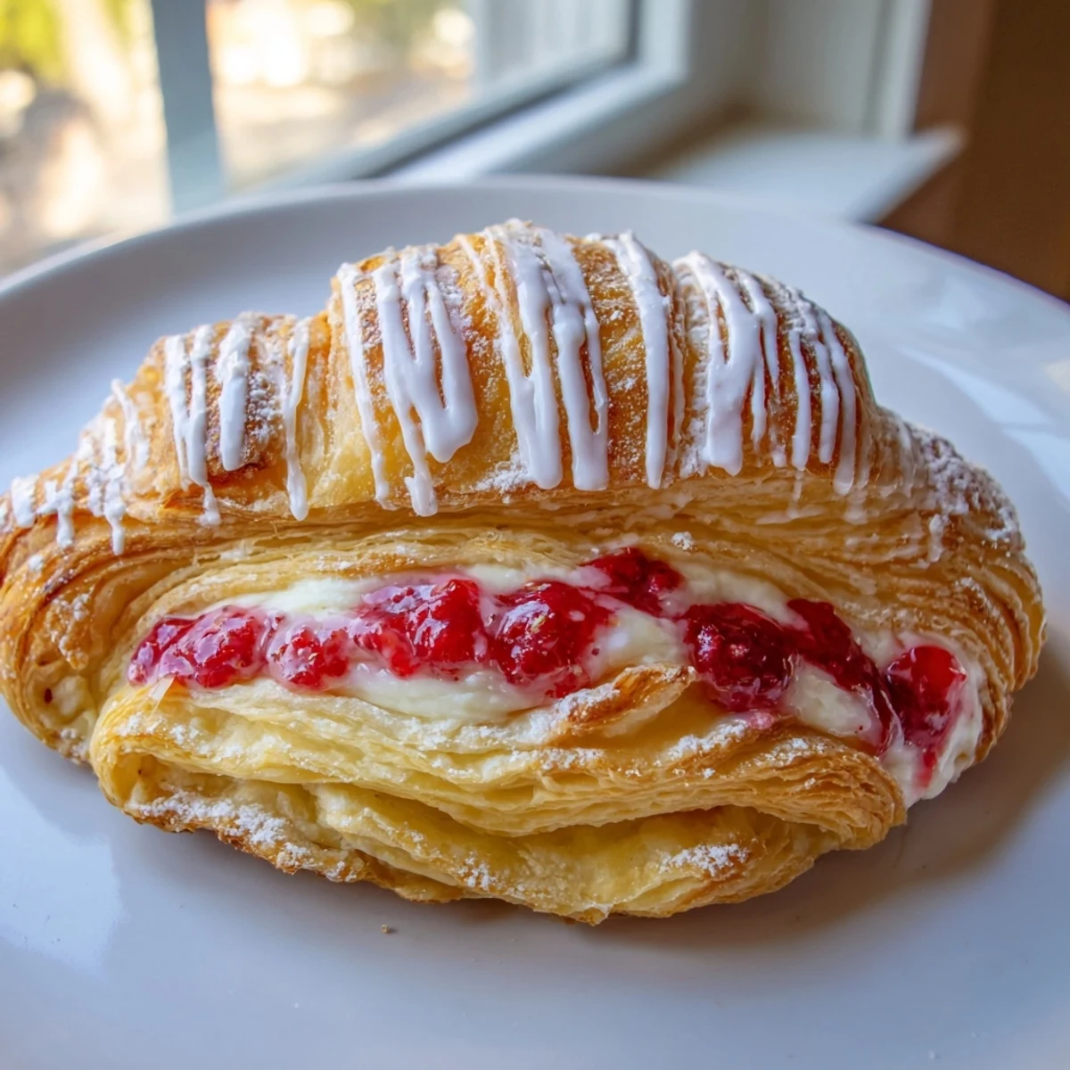 The filling balances sweetened cream cheese with a homemade raspberry reduction thickened with cornstarch. After proofing for 20-30 minutes, the danishes bake until golden and finish with a simple vanilla glaze.
