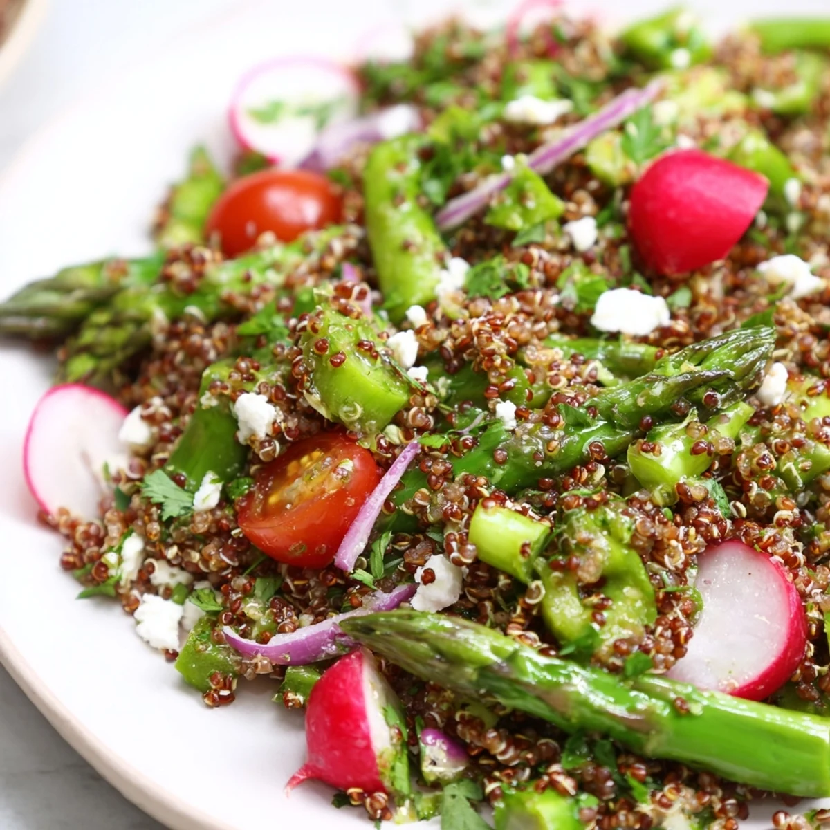 This vibrant bowl combines fluffy quinoa with the season's freshest vegetables—crisp asparagus, sugar snap peas, radishes, cherry tomatoes, and sweet peas. The bright lemon-herb vinaigrette ties everything together with fresh parsley, mint, and chives. Ready in just 35 minutes, this versatile dish works beautifully as a standalone lunch or colorful accompaniment to grilled proteins.
